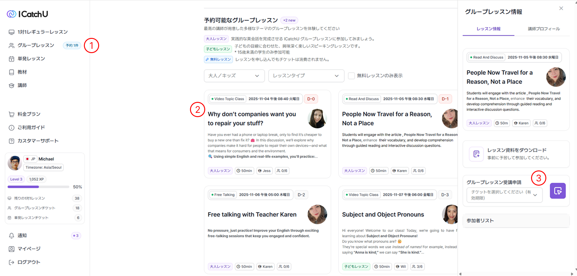 - ICatchUのグループレッスンは、最大6名で多様なテーマについて議論し、実践的な英語コミュニケーションを体験できる特別なレッスンです。